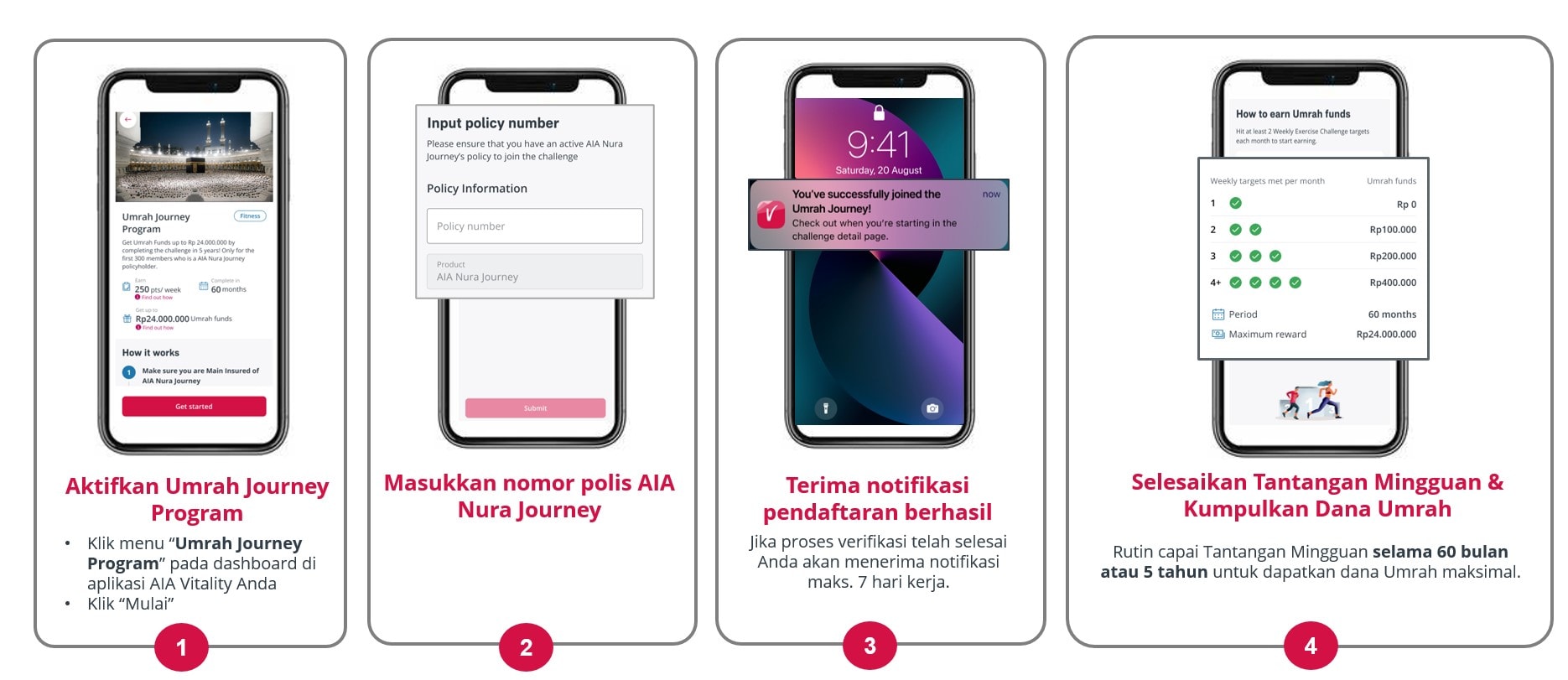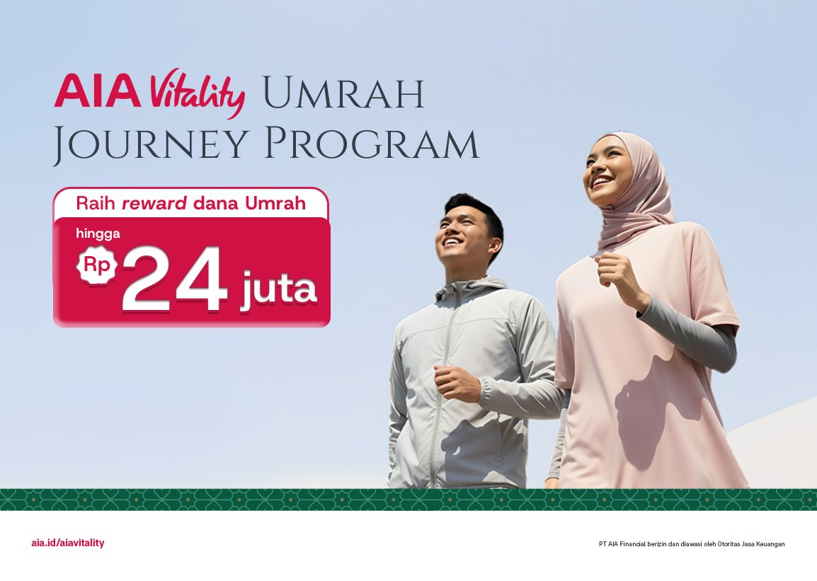 1. Umrah Journey adalah program pada AIA Vitality Indonesia yang memungkinkan Anggota AIA Vitality mendapatkan reward berupa dana umrah dengan menyelesaikan Tantangan Mingguan selama 60 bulan atau 5 tahun. Program ini khusus bagi pihak yang diasuransikan dari produk AIA Nura Journey dengan usia min. 18 tahun ke atas saat pendaftaran AIA Vitality Program.