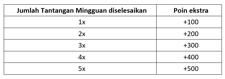 - Periode Tantangan Mingguan berlangsung dari Senin pukul 00.01 hingga Minggu pukul 23.59 setiap minggunya.
